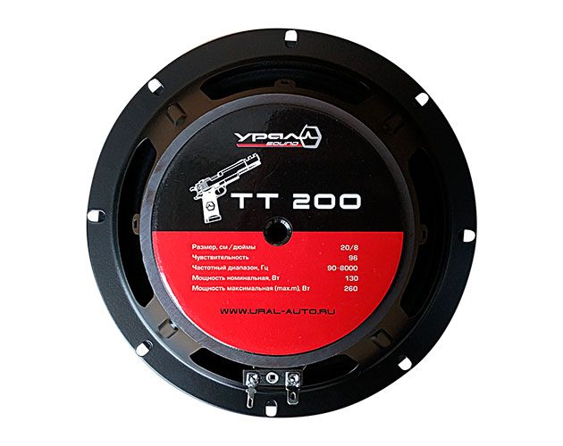 АКУСТИЧЕСКАЯ СИСТЕМА URAL TT 200 -среднечастотный мидрейндж из серии ТТ размером 20 см, с мощной магнитной системой и стильным дизайном выштампованным на пылезащитном колпаке, способный развивать экстремальную громкость от маломощного усилителя и даже от головного устройства, при этом обладает хлестким панчем.
